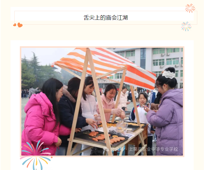 欢声笑语像欢快的音符,在每一寸空气里跳跃。学生们拉着老师穿梭在各个摊位间。老师们也卸下了平日的严肃,脸上挂着温柔的笑,和学生们一起品尝美食、猜灯谜。看着身边师生们脸上洋溢的幸福笑容,深深感受到,这不仅仅是一场简单的庙会,更是一次师生间情感交融的珍贵时刻。在这里,没有课堂的严肃,没有学习的压力,只有无尽的欢乐与温暖。