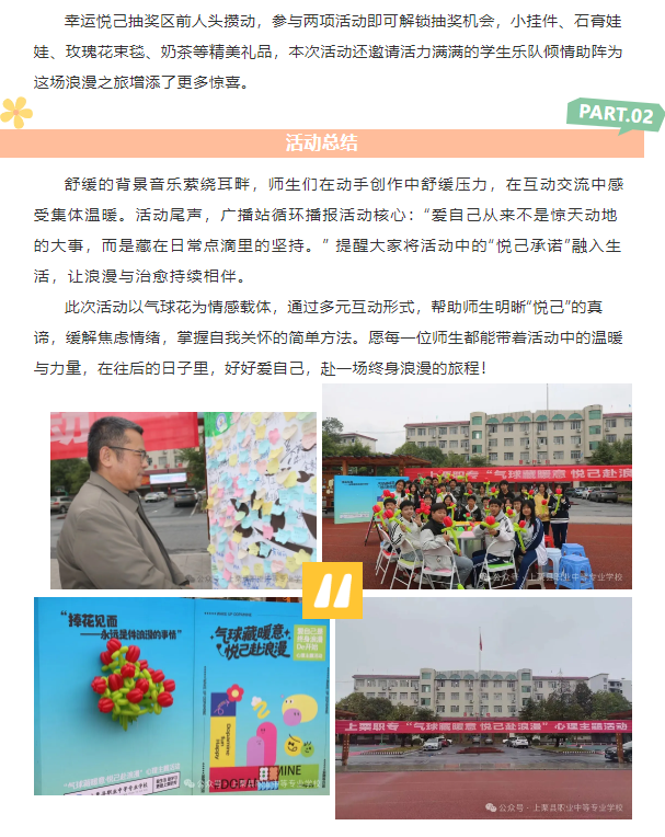 爱自己,是终身浪漫的开始。11月11日,上栗县职业中等专业学校足球场化身浪漫治愈空间,“气球藏暖意,悦己赴浪漫”心理主题活动温情启幕,全校师生共赴一场与自我对话、与温暖相拥的美好之约。